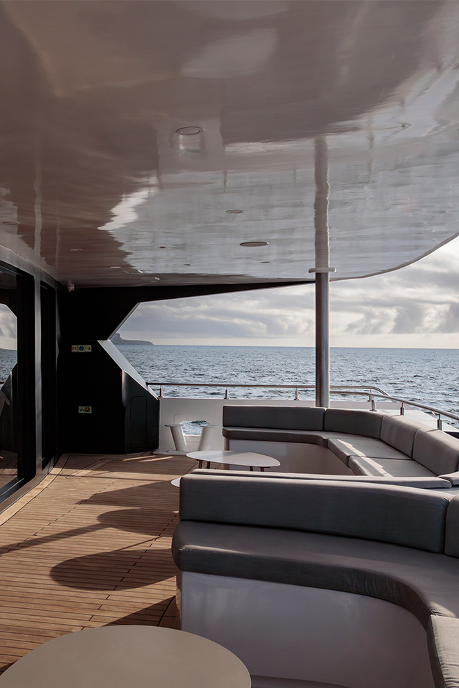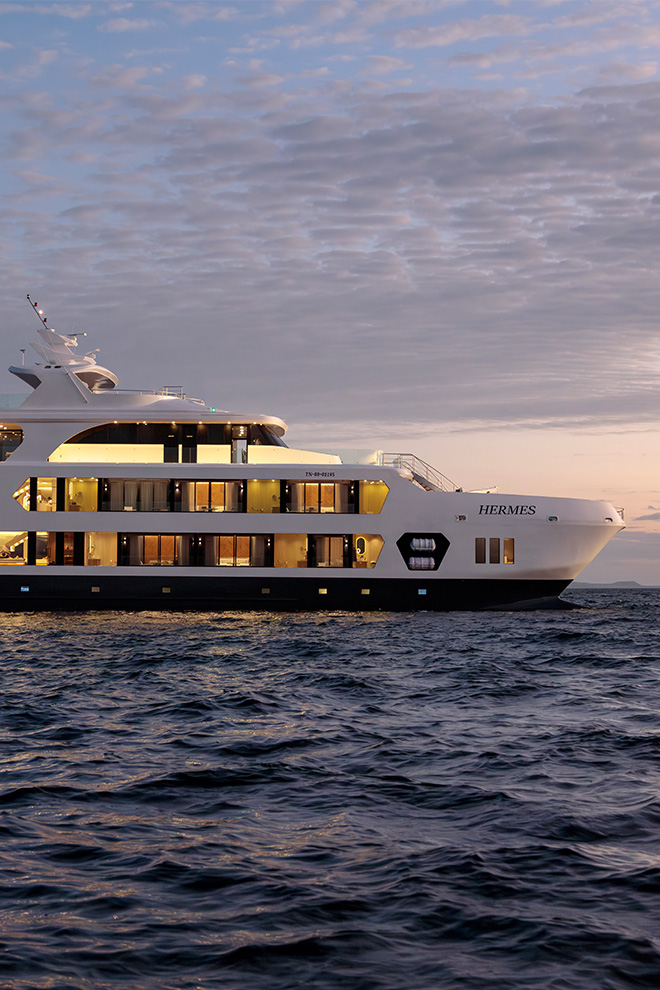 Exploring the Galapagos aboard Hermes Galapagos Catamaran compresses scale in an interesting way: vast volcanic landscapes and open ocean experienced from a vessel carrying fewer than 20 guests, with nearly as many crew. Suites are genuinely spacious, finished in muted tones with floor-to-ceiling windows, private balconies and Jacuzzis angled directly toward the Pacific, where frigate birds and albatrosses pass at eye level. Days are structured around small-group excursions led by certified naturalist guides — hiking across lava fields, snorkelling with sea lions and penguins, or drifting over reefs in a glass-bottom boat — before returning to a ship that feels closer to a floating private residence than a cruise liner.