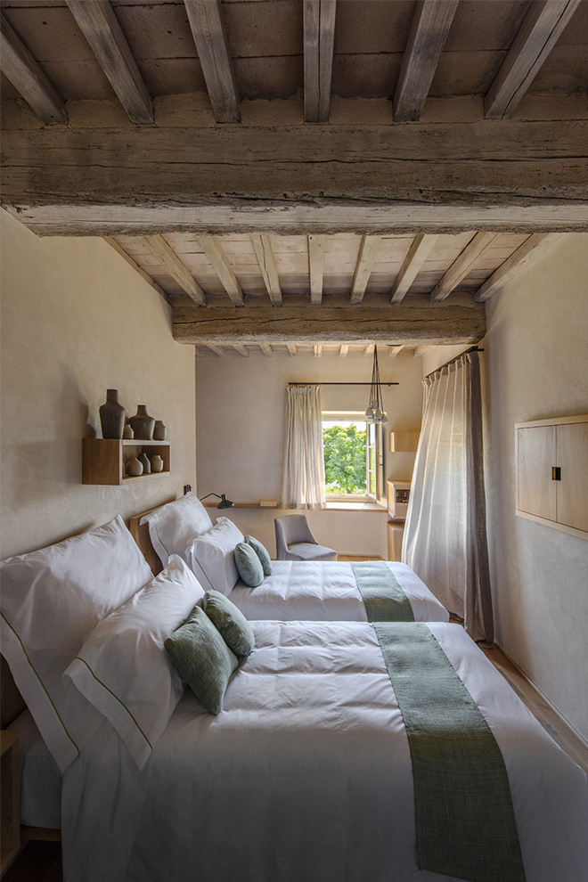 High above Arezzo, Badia di Pomaio offers a persuasive argument for withdrawal. Once a 17th-century monastery, the historic Tuscan building still understands the virtues of restraint: thick stone walls, vaulted ceilings, and cloisters. The conversion is knowingly minimal — pale linens, clean-lined furniture, natural wood — allowing light and proportion to do what decoration never could. With just 13 rooms, there’s a sense of benign seclusion, whether you’re looking out over olive groves, valley folds or the distant outline of Arezzo itself.