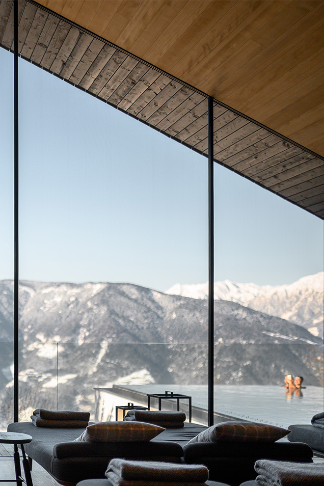 Emerge from a contemporary cave to soak up both the views of the Merano valley basin and the 32°C healing brine water of Miramonti Boutique Hotel’s iconic infinity pool. There’s also a relaxing outdoor onsen pool and an architectural sauna in the forest, with soothing views of the surrounding fauna through its floor-to-ceiling window.